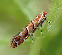 Der kleine Schmetterling aus der Familie der Blatttütenmotten ist ein hübscher Zeitgenosse. Tatsächlich ähnelt er in der Vergrößerung – dank der fransigen Hinterflügel – einer bunten Feder.