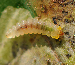 Die Eilarve bohrt sich direkt nach dem Schlupf in das Blatt. Sie beginnt etwa