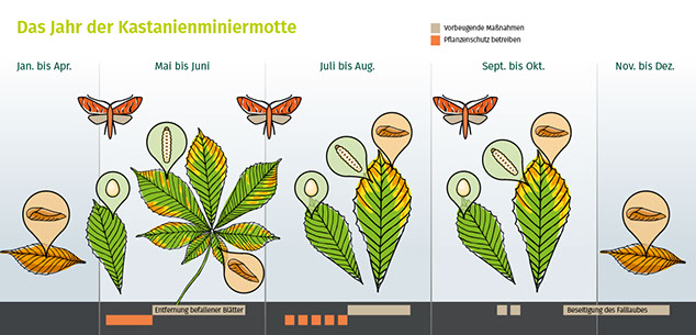 Die letzte Generation eines Jahres überwintert als Larve im Blatt und vergnügt sich im nächsten Jahr erneut. Um den Erstbefall im Frühjahr zu verringern ist es dringend notwendig, das Laub von den Kastanien zu entfernen und zu vernichten.