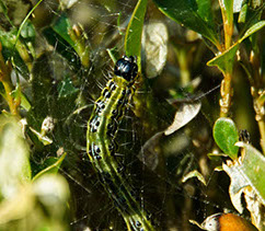 Vielleicht haben Sie sie schon in Ihrem Garten entdeckt; kleine grün-schwarz gestreifte Raupen, die sich an Ihren Buchsbäumen vergehen. Der gefräßige Schädling schlüpft aus den Eiern des „Buchsbaumzünslerfalters“, ein Import aus Ostasien, auf den man gut und gerne verzichten hätte können.