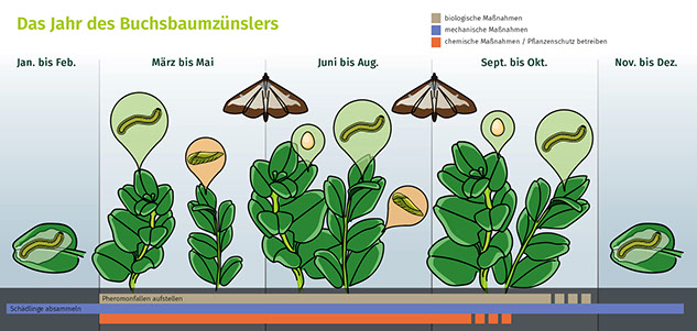 Bei der Bekämpfung des Buchsbaumzünslers ist die frühzeitige Lokalisierung sehr wichtig. Empfehlenswert ist es, im Frühjahr/Sommer die Buchsbäume regelmäßig auf Befall zu kontrollieren. Um ein Aufkommen der Falter festzustellen, wurden spezielle Pheromonfallen entwickelt. Diese klebrigen Fallen locken die männlichen Falter mit Duftstoffen an.