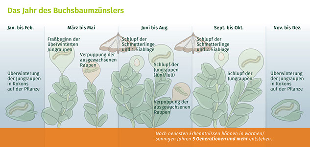 Die letzte Generation einer Saison überwintert in Blättern und Ästen des Buchsbaumes. Zum Schutz vor Kälte überwintern die Raupen in Kokons aus verklebten/verformten Blättern und Spinnweben.